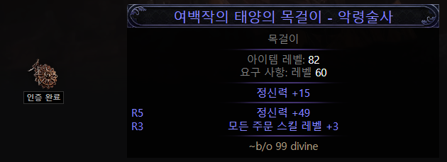 목걸이 베이스 마법 아이템으로 제일 비싼 옵션을 봤더니 아래 그림처럼 아주 예쁘게 붙었다. 정신력도 50에서 하나 빠진 49이고 모든 주문 스킬 레벨+3까지 붙었으니 으뜸 상태의 베이스이다. 주인은 이거 보고 얼마나 기뻤을까. 근데 마법템이라서 조금 비싸게 올라왔던 것 뿐이지 아래 옵션을 포함한 희귀 아이템도 기본이 30디바인 이상 되니 얼마나 비싼 베이스인지 알 수 있다.