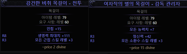 별의 목걸이 일반 아이템을 고유로 변환하기 위해서는 수백개의 별의 목걸이와 수백개의 기회의 오브가 필요하기에 1엑에 올리는 별의 목걸이는 누군가 싹쓸이 하기에 올리자 팔리는게 대부분이다. 별의 보석 하나만 떠도 현재 포스팅 기준으로 90디바인 정도가 되니 도박 한 번 해보는 것도 이해가 간다. 패스 오브 엑자일이 원래 그런 게임이다.