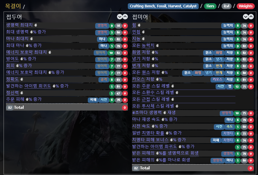 * 목걸이 접미어 유효 옵션: 모든 주문 / 소환수 / 근접 / 투사체 스킬 레벨