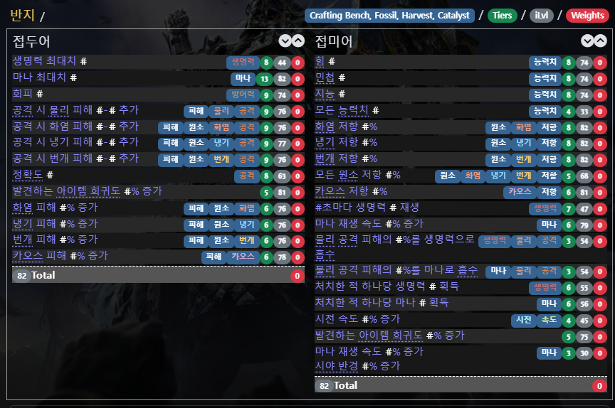 패스 오브 엑자일2에서 반지의 접두어와 접미어 중에서는 목걸이처럼 정말 맛있는 옵션이 무엇이다라고 명확하게 지정할 수는 없어보인다. 후술하겠지만 반지에서는 무조건 저항을 챙긴다는 마인드로 접근을 해야한다. 특히 카오스 저항을 챙기기에 정말 좋은 기회이다.