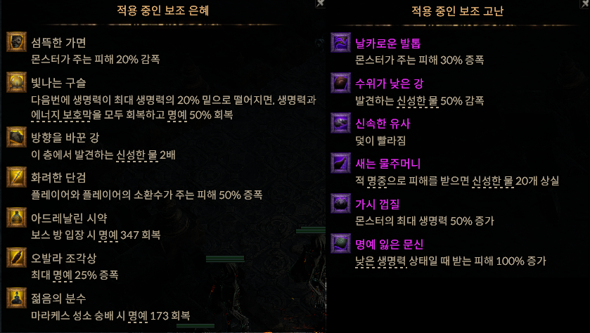 은혜과 고난을 보면 크게 까다로운 고난도 없을 뿐더라 신성한 물을 잘 관리해서 그런지 적절하게 구매도 하였다. 빛나는 구슬을 샀다는 것은 일단 한 번은 살아날 수 있는 기회를 얻었고 고난에서는 덫이 빨라지가나 낮은 생명력 피해 100%를 선택했지만 어차피 안맞으면 된다는 마인드이다. 이렇게 순탄하게 2단계 의지의 시험을 끝냈다. (토끼발은 여기서도 얻을 수 없었다)