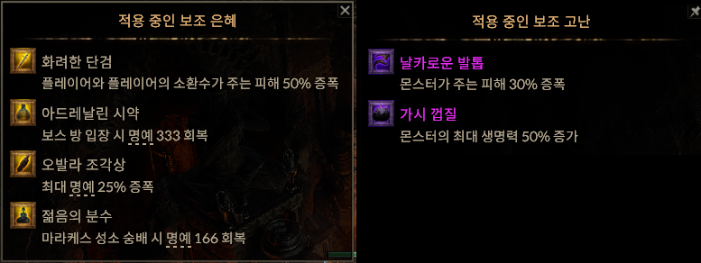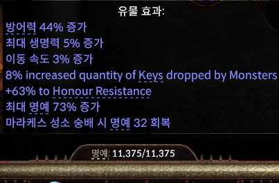유물을 맞출 때는 명예 저항을 60% 이상 맞추려고 했으며 당연히 최대 명예도 챙기는 것을 목적으로 두었다. 하지만 하다보면 느끼는 것이지만 4단계 보스를 잡기 위해서는 이동속도가 무조건 중요하다. 즉사 패턴, 떨어져있는 흰색 구슬을 먹어야하는데 그걸 먹을 때마다 엄청난 이속 디버프가 걸린다. 그걸 이겨내가 위해서는 유물 이동속도 + 장화 이동속도 + 산토끼발까지는 있어야 편하게 플레이가 가능하다.