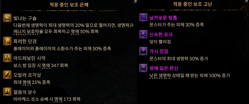 특히 1단계에서 최대한 명예를 안닳게 컨트롤하고 신성한 물을 마시면서 좋은 은혜를 얻어야하는것이 중요하다. 초반에 하도 맞아서 명예를 채우는 전략이다. 사실 1단계 힘의성소를 끝내면서 느낀점은 이번판은 무조건 전직 하겠다는 생각밖에 없었다. 왜냐하면 지금까지 했던 판 중에서 제일 운이 좋았다.