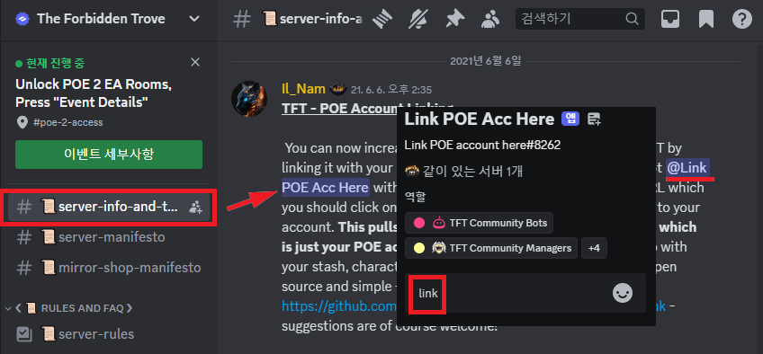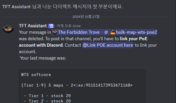 패스 오브 엑자일 TFT는 오랜 시간 디스코드에서 함께 해왔다. 그래서 봇으로 자동화 응답이 굉장히 잘 되어있는데 그 중 하나가 바로 계정 연동 유도이다. TFT는 패스 오브 엑자일 유저만 활동할 수 있도록 한다. 계정을 연동하기 때문에 밴이나 블랙 시 다른 계정으로 만들어오기 어려운 환경이가 대화창도 굉장히 깔끔하다.