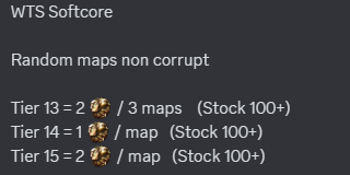 | WTS Softcore Random maps non corrupt Tier 1-5 = 1 :ex: / 5 maps (Stock 40+) Tier 6-9 = 1 :ex: / 4 maps (Stock 40+) IGN: 내 아이디 |