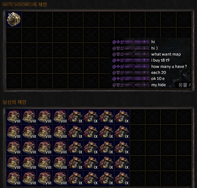 몇 개 가지고 있냐고 물어보면 개수 세어서 알려주면 되고 구글 번역 띄워놓고 해도 무방하니 너무 겁먹지 않았으면 한다. 물론 난 매번 겁이 난다. 이렇게 해서 총 70개의 맵을 팔았고 길드 보관함에는 또다시 구멍이 숭숭 났다. 자주 개수 체크해서 꽉 차지 않도록 자주 비워줘야겠다. 소소하지만 그래도 이 맛에 패스 오브 엑자일2를 하는게 아닐까.