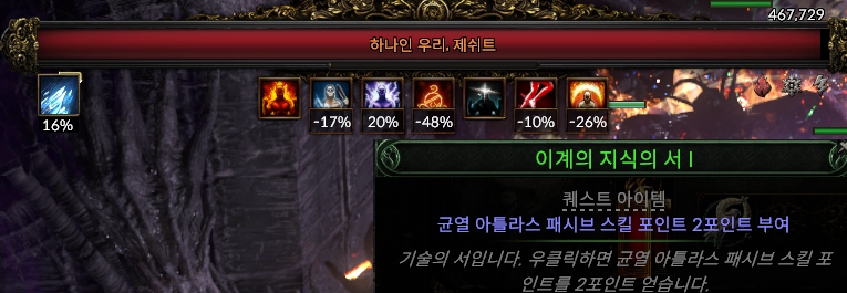 모두 끝나면 균열 보스가 등장한다. 하나인 우리, 제쉬트인데 일반 보스보다 조금 강한 느낌이다. 3인으로 클리어 해봤는데 무리 없이 깰 수 있는 수준이다. (첫 보스는) 클리어 시 이계의 지식의 서가 드랍되며, 균열 아틀라스 패시브 스킬을 2포인트 찍을 수 있는 퀘스트 아이템이다.