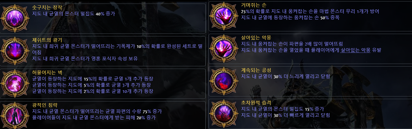 참고로 처음 클리어하고 나서 대부분 찍으시는데 '허물어지는 벽'이다. 도박성이 강하지만 균열 맵에서 균열이 추가로 더 등장하는 패시브트리인데 10개 등장하는 맵이 걸리면 진짜 기분이 너무 좋다. 너무나 설레는 서브 컨텐츠가 아닐까 생각된다.