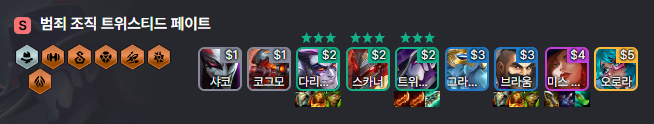 범죄조직 트페덱이 좋은 점은 무엇이냐면 8레벨에도 오로라 (5코스트) 없이 덱 구성이 좋다는 점이다. 6레벨부터 한 단계씩 강해지기 때문에 힘이 빠지는 구간이 많이 없다. 또한 범죄조직 자체가 피해 증폭과 체력을 늘기 때문에 메인 탱커인 다리우스와 메인 딜러인 트페를 기준으로 덱 구성이 강해진다.