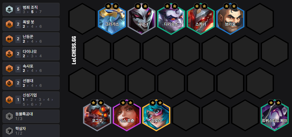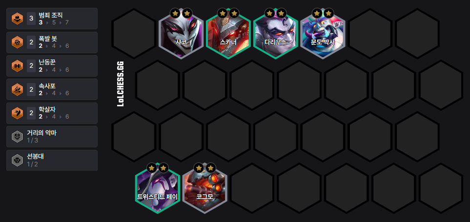 고민할 것은 딱 하나다. 문도는 1코스트라 3성을 못만든다는 가정하에 그라가스 2성이 되면 교체를 해주면 끝이 난다. 학살자를 활성화 할 수 있지만 문제는 샤코와 문도의 학살자보다는 3성 그라가스 2성이 훨씬 더 강할 것이라는 판단이다. 결론적으로 6레벨에 리롤 쳐서 트페와 다리우스 붙이고 8레벨까지 5범죄조직을 만들어주면 된다.
