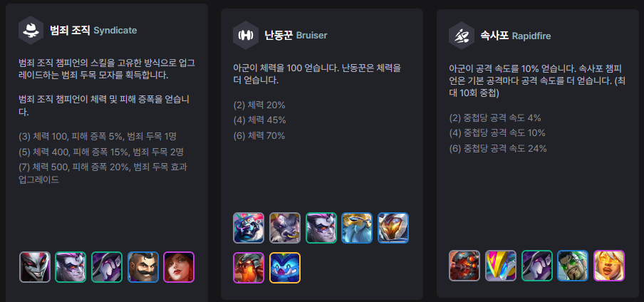 주요 시너지 설명 및 주요 챔피언 (아이템)