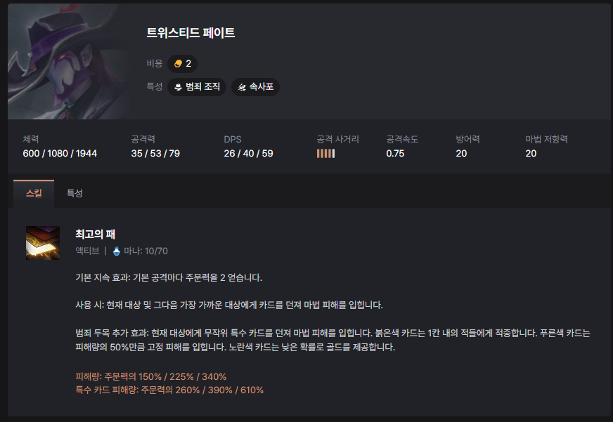 트위스티드 페이트는 범죄조직과 속사포를 특성으로 가진 2코스트 원거리 딜러 기물이다. 기본 지속효과가 기본 공격마다 주문력을 2 얻기 때문에 기본 공격 당 공속이 오르는 속사포와 함께 시간이 지날수록 엄청 강해지는 기물이다. 그래서 구인수가 필수인 아이템이라고 할 수 있다. 공격속도만 주구장창 올려도 밥값을 하는 친구니까 말이다.