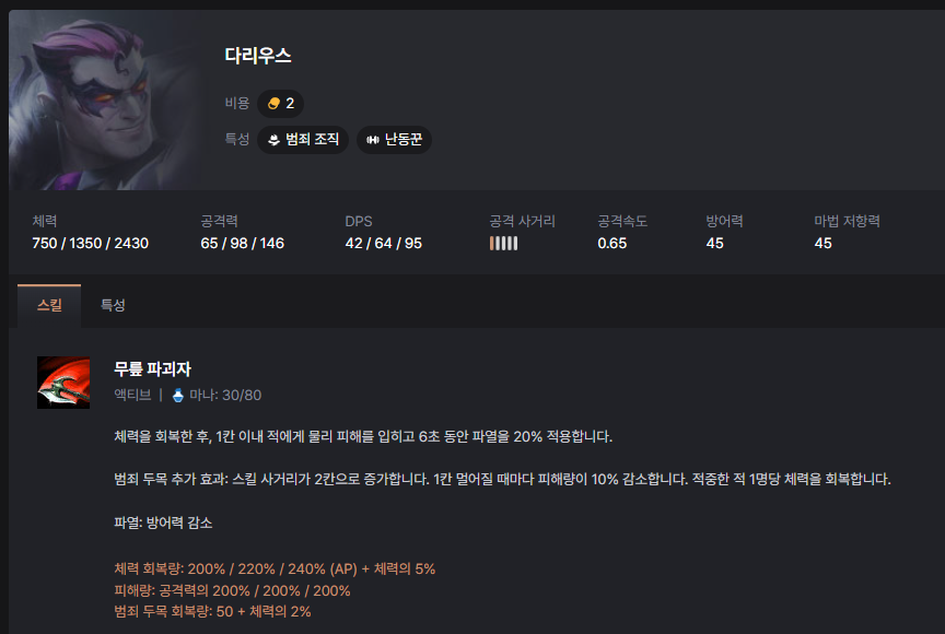 다리우스는 범죄조직 난동꾼 2코스트 챔피언이다. 범죄조직 특성 상 두목을 지정하여 스킬을 변경할 수 있는데, 다리우스의 경우에는 인게임 Q 를 스킬로 사용한다. 파열이 존재하여 별도의 방깎은 필요 없으며 두목으로 추가 효과를 가져가면 스킬 사거리가 2로 변경이 된다.
