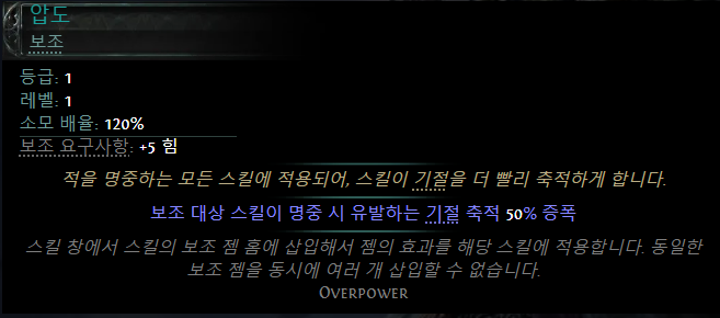 해당 스킬에는 압도라는 보조 젬을 박아서 사용한다. 보조 대상 스킬이 명중 시 기절 축적을 50% 증폭시킨다. 아무리 강한 적이라고 하더라고 기절 축척이 매우 잘 되기 때문에 뼈 박살을 금방 사용할 수 있다.