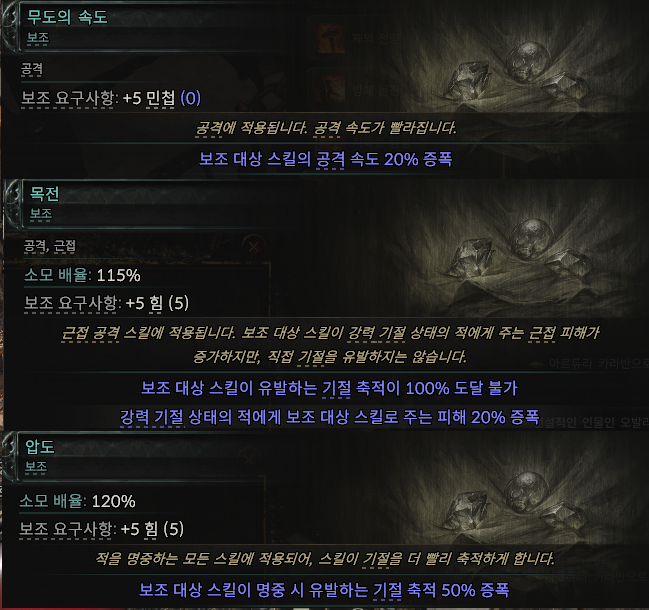 * 하급 주얼러가 없다면 압도 + 목전 또는 목전 + 무도의 속도 장착
