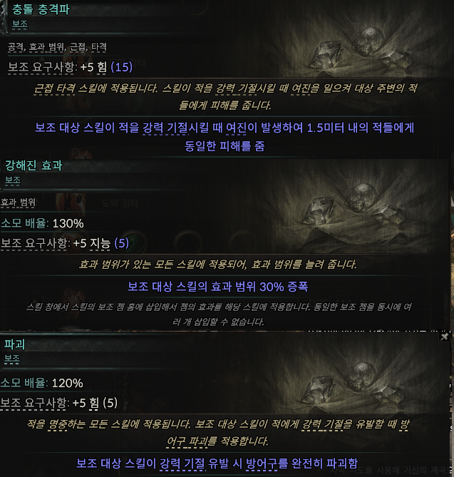 뼈 박살의 경우에는 보통 마무리 데미지 용으로 넣으며, 광역 위주의 데미지이기 때문에 범위 관련된 보조젬을 많이 넣는다. 하위 쥬얼러만 사용한다고 가정했을 때 3개의 보조젬을 사용하며, 강력 기절 시 추가 효과를 주는 충돌 충격파와 파괴를 들고 강해진 효과로 범위를 늘려 광역 스킬의 종지부를 찍을 수 있도록 한다.