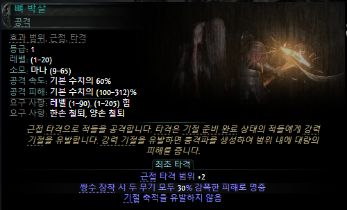 몰려오는 강타는 그냥 한 번 점프 뛴 뒤에 밝은 원이 뜨는 몬스터 (기절 준비 상태)에게 뼈박살을 쓰면 된다. 보스전이나 네임드 전에서는 초반에는 평타나 혹은 사전 스킬을 쓴 뒤에 밝은 원이 뜨는 순간 뼈박살을 사용하면 기절이 된다. 그때 완벽한 타격까지 쓰는게 콤보다.