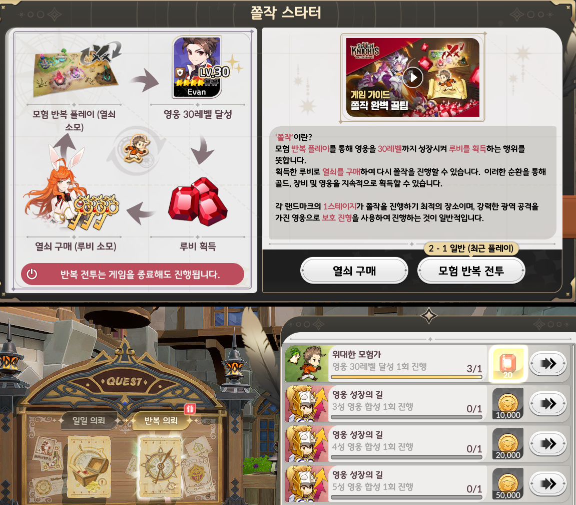 세븐나이츠 리버스에는 쫄작 스타터라고 불리우며, 쫄작에 대한 설명이 자세하게 나와있다. 영웅 30레벨을 만들고 루비를 획득하며, 그 루비를 소모해서 열쇠를 구매하여 다시 모험을 반복플레이를 한다. 당연히 영웅이 30레벨이 되면 자연스럽게 변경을 해주기 때문에 우리는 무과금이어도 루비를 얻을 수 있는 구조가 된다.