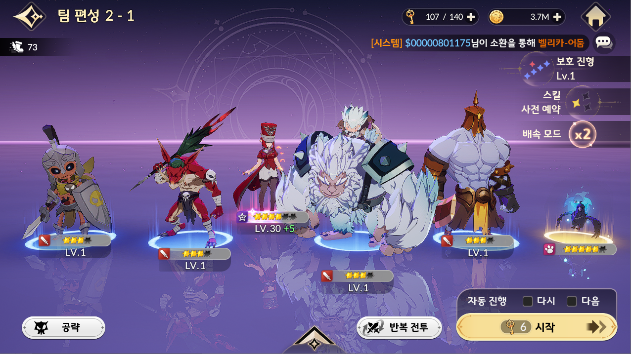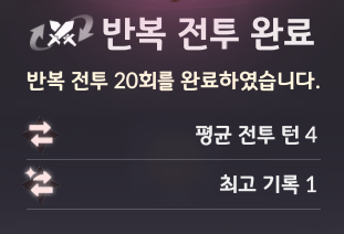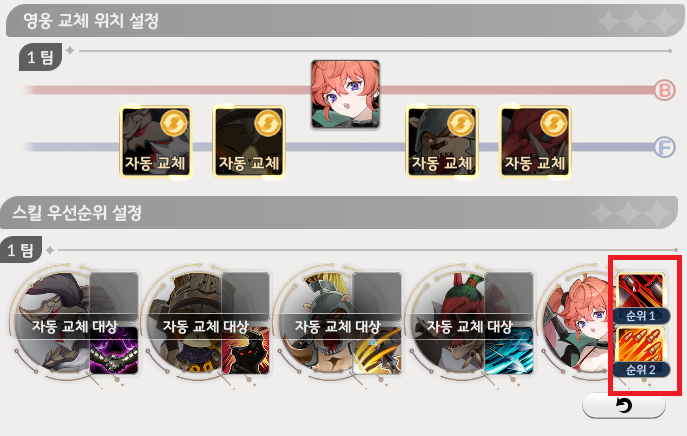 세팅은 간단하다. 진형은 보호진형으로 바꿔 메인 딜러 보호하기로 선택 후 반복 전투를 클릭한다. 세팅은 메인 유닛 빼고 자동 교체로 두고 스킬 우선순위 설정은 1순위 2순위 모두 메인 딜러로 지정해두면 0턴으로 게임이 끝나는 것을 알 수 있다. 물론 시간이 많으면 누굴 해도 상관이 없기는 하나 그래도 쫄작용 캐릭터 하나쯤은 두는게 좋지 않을까 생각된다.