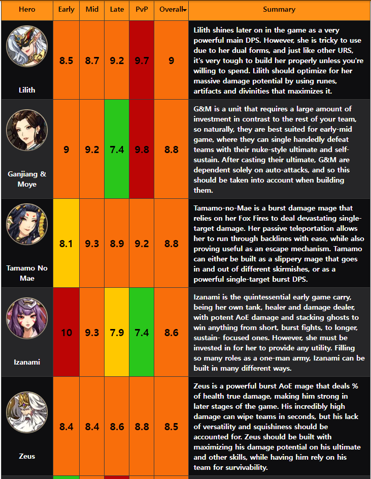 이자나미는 지금 현재 덱에서 주력으로 키우고 있는 영웅이다. overall 8.6으로 1,2위와 그렇게 차이가 나지 않는다. 일단 자체 힐도 있고 스킬 구성도 광역으로 구성되어있어서 굉장히 좋은 마법 딜러라고 생각한다.
