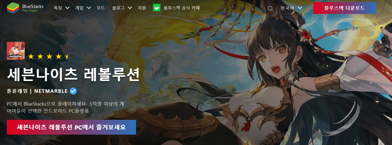세븐나이츠 레볼루션이 워낙 큰 게임이다보니 블루스택에서는 별도의 페이지를 만들어 홍보하고 있다. 맞춤형 블루스택 페이지가 있다면 당연히 설치 오류나 최적화 문제는 걱정하지 않아도 된다.