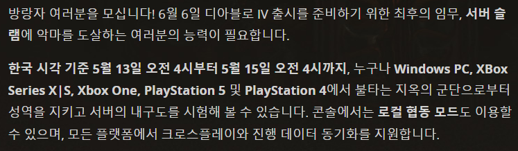 디아블로 4 서버 슬램 오픈 시간은 한국 시간 기준으로 5월 13일 오전 4시부터 5월 15일 오전 4시까지이다. 금요일에서 토요일로 넘어가는 오전4시이기 때문에 퇴근하고 잠을 자던지 아니면 일찍 자고 일찍 일어나는 수 밖에 없다. 엑스박스나 콘솔 등 모든 플랫폼에서 크로스 플에이와 진행 데이터를 동기화 하기 때문에 자유롭게 오갈 수 있다.